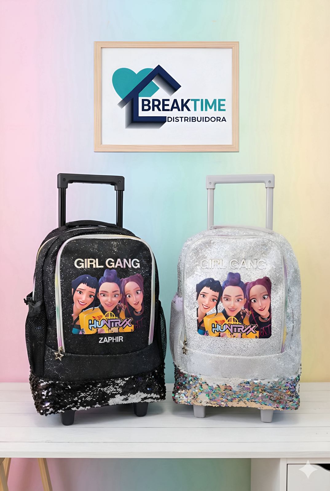 Mochila escolar 17” con carro, ideal para primaria. Destaca por su diseño súper llamativo, con acabado glitter plateado, base de lentejuelas tornasoladas y estampa frontal “Girl Gang”. Pensada para llevar útiles cómodamente, cuidando la espalda gracias a su sistema con ruedas.
